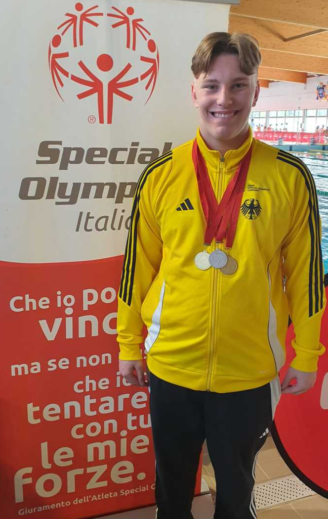 Am Wochenende vom 28/29.03.2026 fand der europäische Wettkampf der Special Olympics - der 2. Giulio Velati Swimming Memorial - in Mailand (Italien) statt. Für die deutschen Athletinnen und Athleten ist das Turnier eine wichtige internationale Begegnung. Zu der deutschen Delegation von insgesamt 12 Sportlern zählte auch unser Max.